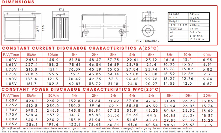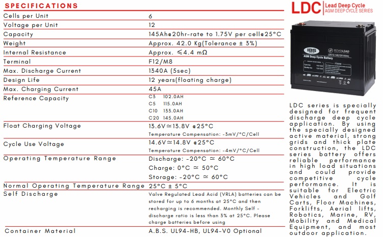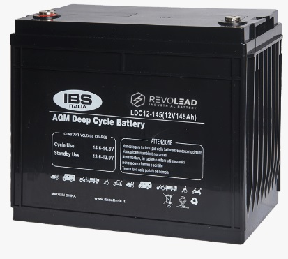 Batteria Revolead LDC12-145 ciclica AGM al piombo ermetica (ex Luminor). Hanno una tensione di 12V, una capacità di 145Ah/20h, un terminale F12-M8 e dimensioni 341 x 172 x 274 mm ( 280 mm altezza con terminali inclusi). Ideale per piattaforme aeree, pulizia industriale, golf car, veicoli elettrici e per disabili, nautica.
