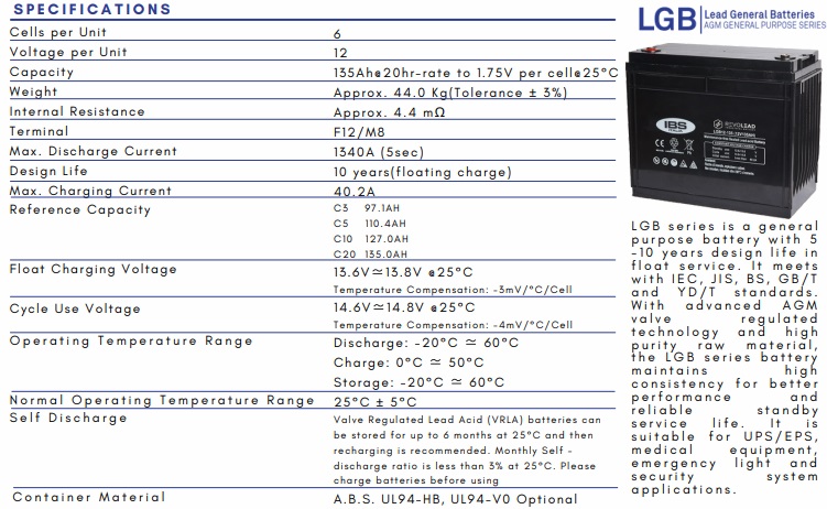La Revolead LGB12-135 (ex Luminor) è una batteria AGM al piombo ermetica, progettata per garantire continuità di alimentazione, sicurezza e lunga durata in applicazioni tampone e servizi continui. Perfetta per ambienti chiusi, senza emissioni e completamente senza manutenzione.