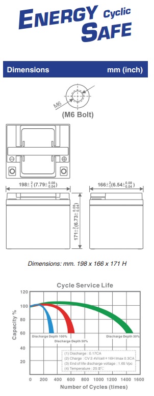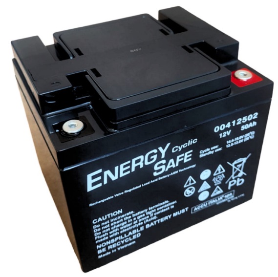 Batterie Energy Safe 12V 50Ah CP. 00412502 al piombo ermetiche VRLA con tecnologia AGM, adatte a impieghi ciclici come la trazione leggera e l’energy storage. Hanno una tensione di 12V, una capacità di 50Ah/20h, un terminale FM6 e dimensioni di 198 x 166 x 171 mm (altezza con terminali inclusi).