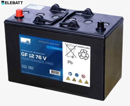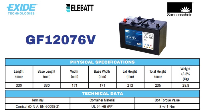 Batteria EXIDE 12V 87.9A Gel VRLA linea Sonnenschein CP. GF12076V, adatte per Pulizia industriale e Movimentazione merci. Hanno una tensione di 12V, una capacità di 87.9Ah/20h e dimensioni di 330 x 171 x 213 mm ( 236 mm con i terminali ) per 28.8 kg di peso. Terminale 8 AP.