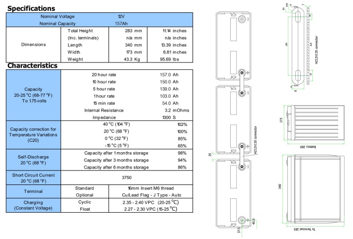 Batteria Haze 12V 169Ah HZB12-135 al piombo ermetica VRLA con tecnologia AGM, adatta per sistemi di allarme e antincendio, UPS, gruppi di continuità, nautica. Ha una tensione di 12V, una capacità di 169Ah/20h, un terminale M6 e dimensioni di 340 x 173 x 283 mm.
