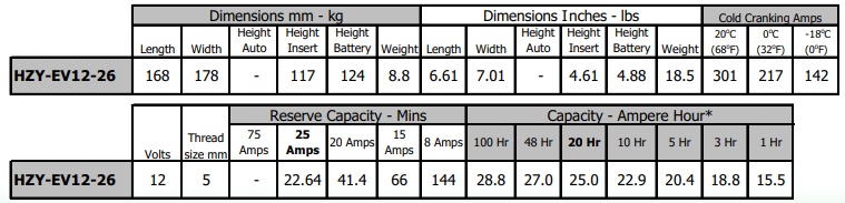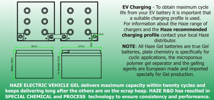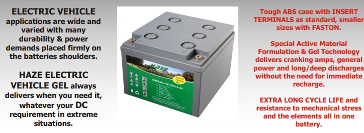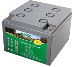 Batterie Haze 12V 25.70Ah Gel CP.HZY12-26EV Gel Cicliche VRLA Ermetiche al piombo, adatte per Pulizia industriale, Veicoli elettrici, Nautica e Camperistica . Hanno una tensione di 12V, una capacità di 25.70Ah/20h e dimensioni di 168 x 178 x 124 mm per 8 kg di peso.