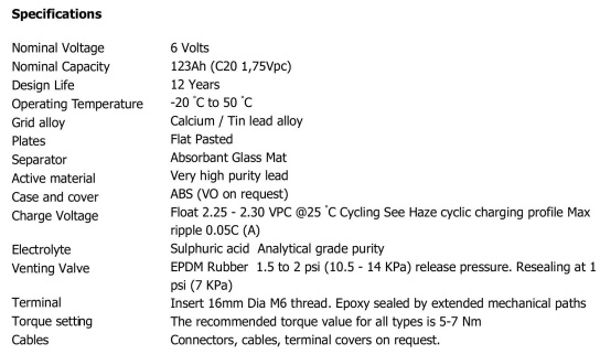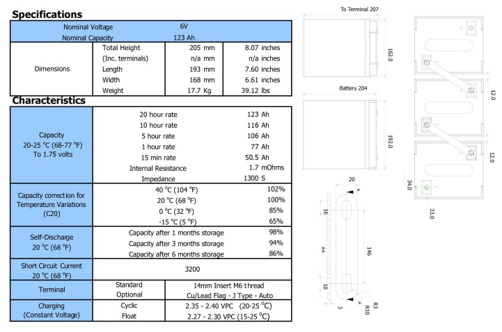 La Batteria è progettata per offrire un’eccellente affidabilità e prestazioni ottimali. Con una tensione di 6V e una capacità di 122.80Ah/20h, questa batteria è in grado di soddisfare le esigenze energetiche di diverse applicazioni. Il terminale Vite M6 assicura una connessione sicura e affidabile, garantendo un funzionamento senza problemi.