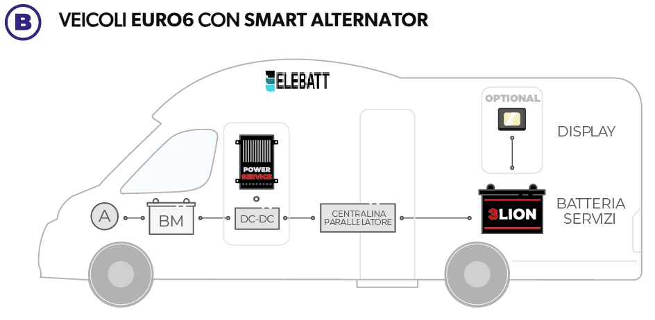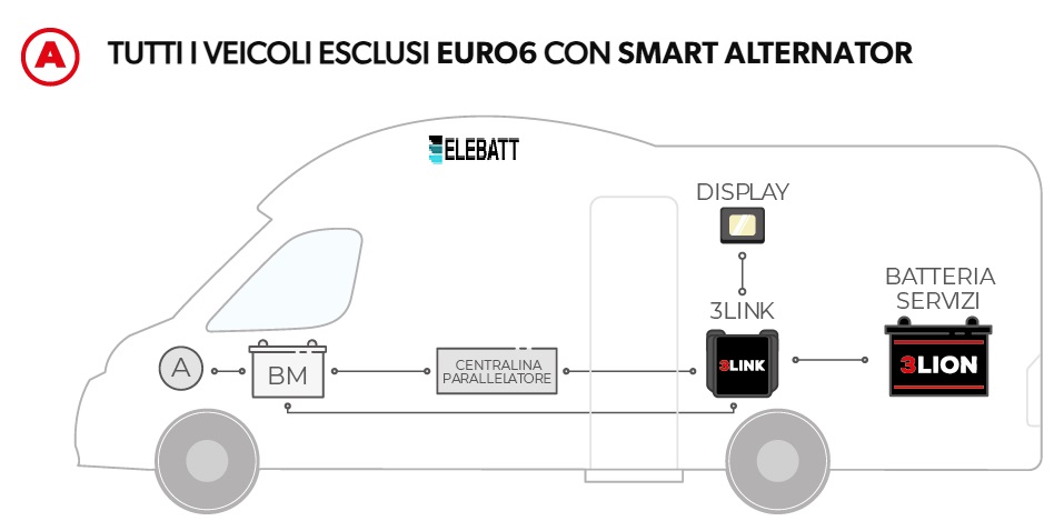 Peculiarità: Grazie a questo tipo di impianto e al 3LINK è possibile ottenere ricariche molto veloci della batterie servizi al litio salvaguardando comunque l’impianto elettrico originale.