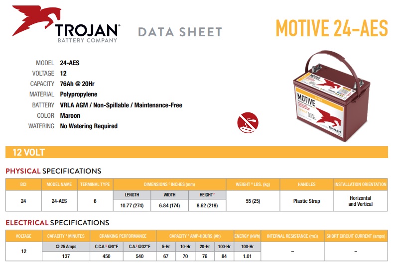 La batteria Trojan AGM 24-AES 12V 76Ah è una soluzione affidabile e di alta qualità per le tue esigenze energetiche. Ideale per una vasta gamma di applicazioni, questa batteria AGM da 12V offre una capacità di 76A, garantendo prestazioni ottimali e una lunga durata. La batteria Trojan 24-AES è progettata per offrire efficienza e affidabilità. Per ulteriori dettagli tecnici e specifiche complete, consulta la scheda tecnica del prodotto.