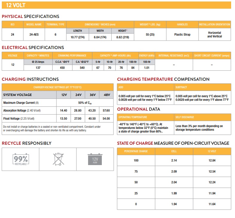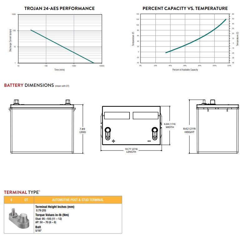 La batteria Trojan 24-AES è AGM: La carica di questa batteria può essere effettuata solo con il caricabatterie con profilo di carica AGM (NON DEVONO ESSERE CARICATE CON IL PROFILO FLOODED come le T105 in acido.