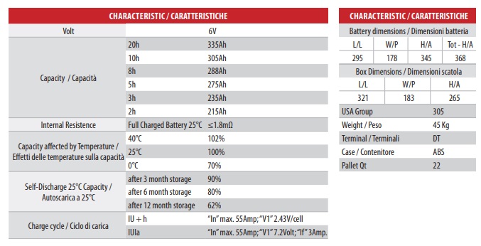 • Bassa autoscarica e resa amperometrica elevata: La batteria ha un basso tasso di autoscarica, mantenendo la carica più a lungo, e offre un’elevata resa amperometrica durante la carica, fornendo energia in modo efficiente.