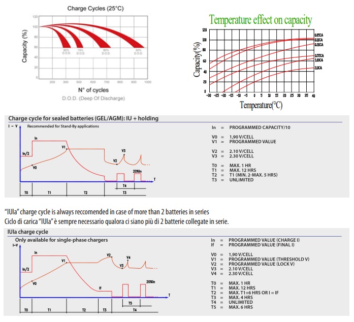 • Per ciclo di carica e taratura carica batteria, vedere schede tecniche batterie