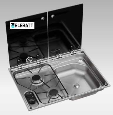Piano cottura Dometic CVC1600G RH, cucinare e lavare può essere un piacere. Anche in una piccola cucina da camper. Questa combinazione fornello/lavello ha tutto il necessario. Anche in spazi piccolissimi. Due fuochi a sinistra e lavello a destra. Comandi ergonomici, accensione automatica e dispositivo di spegnimento del gas. Inoltre, il coperchio in vetro temperato con chiusura silenziosa offre un ulteriore spazio di lavoro.