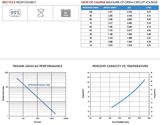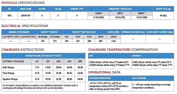 La Batteria Trojan J305H ciclo profondo presenta le seguenti caratteristiche tecniche: