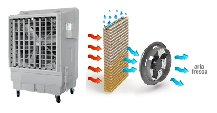 Il raffrescamento evaporativo sfrutta il principio naturale dell’evaporazione. L’aria calda presente nell’ambiente o esterna per i sistemi fissi, viene aspirata attraversando filtri intrisi di acqua fredda che abbassano sensibilmente la temperatura. Quindi viene reimmessa nell’ambiente rinfrescata ed igienizzata tramite una ventola interna innescando un processo di evaporazione con acqua nebulizzata nell’aria abbassando la temperatura nei paraggi.